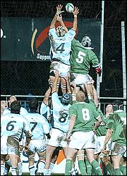 Patricio Albacete (izquierda) gana la pelota en el lines, durante la victoria de Los Pumas ante Irlanda Desarrollo XV