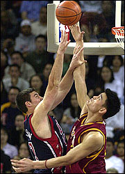 Yao Ming bloquea un tiro de Raef Lafrentz de Team USA