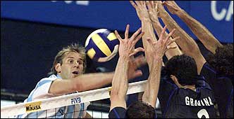 Con otro Luna Park repleto, Argentina e Italia parecían jugarse más que el quinto puesto. Milinkovic remata ante el triple bloqueo azzurro, pero el local no pudo vencer por segunda vez en el torneo a su rival y terminó en el sexto lugar