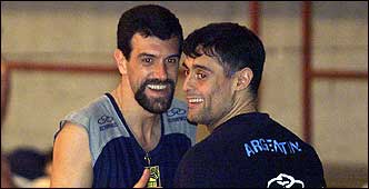Hugo Conte y Jorgue Elgueta bromean durante el entrenamiento de la selección argentina de voley, horas antes de enfrentar a Francia por los cuartos de final del Mundial