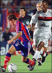 Romagnoli, uno de los creadores de San Lorenzo, sufre la marca de un jugador del Flamengo, ante quien los de Boedo conquistaron su primer título internacional
