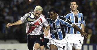 Eduardo Coudet (izquierda) se quiere llevar la pelota ante Gilberto; el Gremio vapuleó a River y lo eliminó de la Copa.