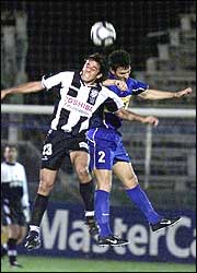 Salta Nicolás Burdisso (derecha) ante la presión de Jorge Martínez; el bicampeón Boca ganó 2-0 en Montevideo y se adjudicó el Grupo 6.