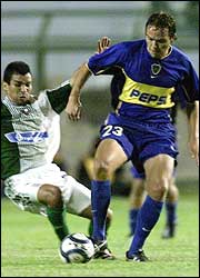 Boca comenzó jugando como si fuera el dueño de casa con una serie de ataques a fondo que obligaron al arduo trabajo del arquero local Alex Varas, incluso una lucida defensa con el pie de un disparo a boca de jarro de Guillermo Barros Schelotto.