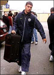 ¿VALIJA CON GOLES? Sebastián Battaglia, uno de los goleadores de Boca en este torneo, llega al entrenamiento preparado para partir más tarde a Inglaterra, donde jugará con el Manchester (Fotobaires.com)