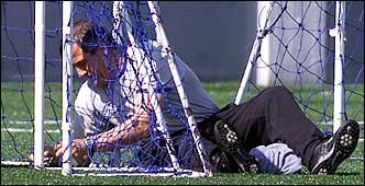 Oscar Washington Tabárez lucha con las redes de un arco de entrenamiento, toda una postal del momento por el que atraviesa en la conducción del plantel de Boca