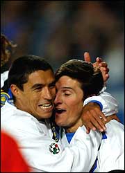 El colombiano Iván Córdoba felicita a su compañero del Inter de Milán, el argentino Javier Zanetti, que acaba de anotar