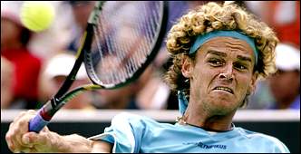 El brasileño Gustavo Kuerten con su revés pudo vencer al marroquí Hicham Arazi por 6-4 7-6 6-3.